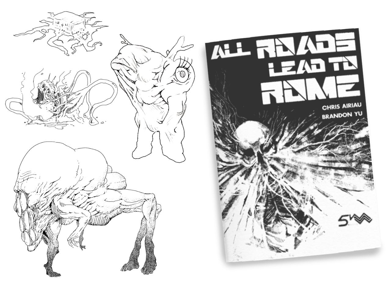 As I mentioned last month, even before the first episode dropped, I started writing a hexcrawl set in a city on a Rimward Core world. I got in touch with Brandon Yu a.k.a. Chaoclypse, and he’s deep in sketches for this zine!