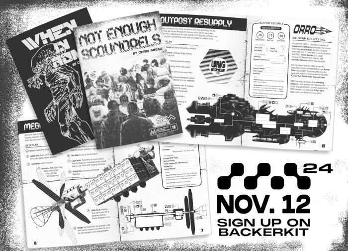 Written and designed by Chris Airiau, with game development by Josh Domanski, and ship art from Carly A-F and debuting ship art by Tim Zygor, a.k.a. tim4242, this zine is a supplement and adventure generator, with procedures involving shady NPCs for players to get mixed up with between the horrors.